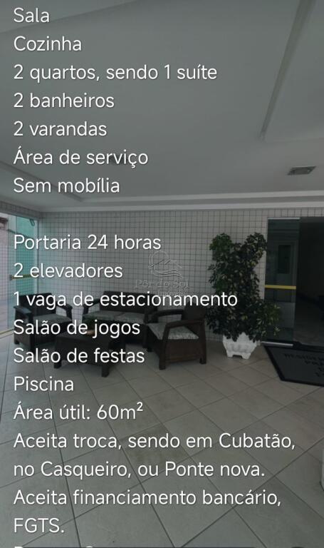 Apartamento com 2 dormitórios (sendo 1 suíte), 2 varandas, sala, cozinha, banheiro social, área de serviço e 1 vaga de garagem.