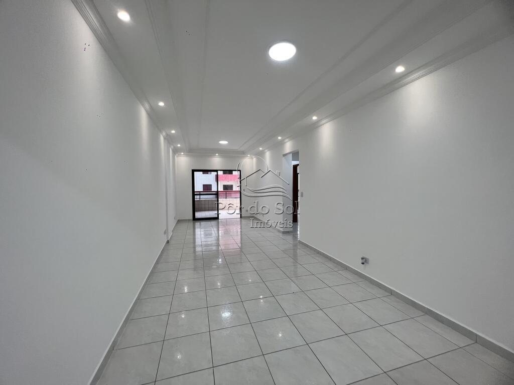 Apartamento amplo com 3 dormitórios, sendo 2 suítes, sala para 2 ambientes com sacada gourmet e vista para o mar, cozinha americana com armários planejados, banheiro social e área de serviço.